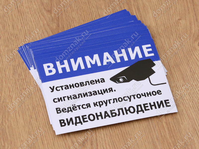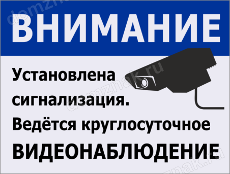 Информационный стикер «Установлена сигнализация. Ведётся видеонаблюдение», размещается в помещении либо на улице. Информирует граждан, что объект находится под надежной охраной, защищает от посягательств. Знак устанавливается в торговых центрах, павильонах в самых заметных местах.