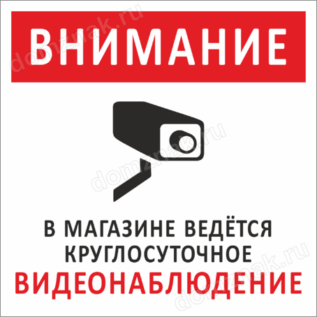 Наклейка В магазине ведётся видеонаблюдение изготавливается из матовой виниловой плёнки. Толщина наклейки 160 мкм, что позволяет легко наклеить ее на любую ровную поверхность без образования пузырей воздуха и складок.