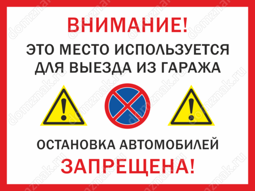 Вы можете заказать Табличку «Выезд из гаража, остановка запрещена» по индивидуальному дизайну или воспользоваться готовым вариантом от нашей компании.