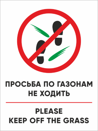 Табличка «Просьба по газонам не ходить, Please keep off the grass» изготавливается на основе из пластика ПВХ или оцинкованного металла.