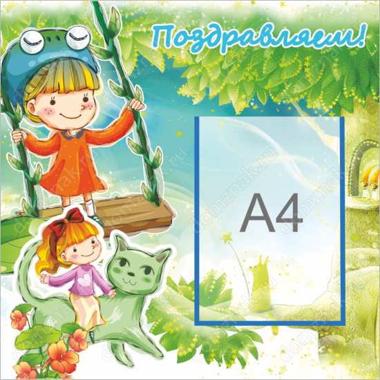 Информационный стенд для детского садика «Поздравляем» отличается высокой детализацией рисунка, множеством мелких элементов и необычным общим стилем. Он смотрится действительно сказочно! Стоит лишь поместить в карман фотографию именинника – и все будут знать о важности этого дня, а сам ребенок будет чувствовать свою значимость.