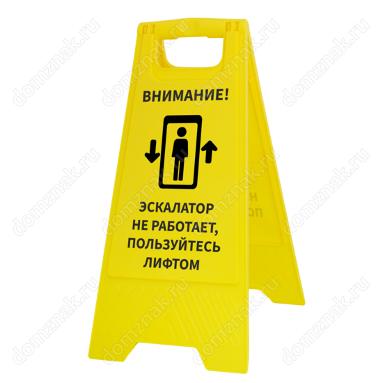 Если в вашем заведении перестал работать эскалатор, тогда вам понадобится табличка на пол «Эскалатор не работает, пользуйтесь лифтом». Она устанавливается рядом с не функционирующим эскалатором, в зоне видимости для посетителей. Табличка имеет яркую контрастную надпись, выполненную черным цветом. Ее усиливает изображение, которое улучшит визуальное восприятие нанесенного послания. Желтая поверхность таблички отлично сочетается с надписью и привлекает всеобщее внимание.
