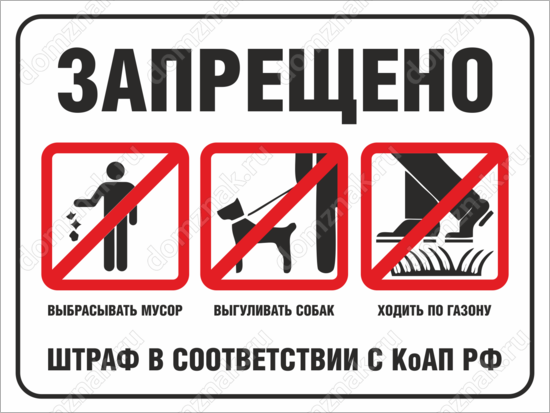 Табличка «Запрещено мусорить, выгуливать собак, ходить по газону» изготавливается на основе из пластика ПВХ или оцинкованного металла.