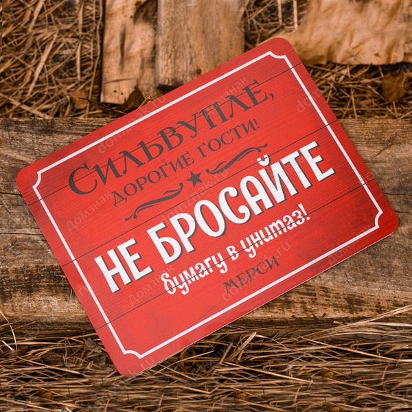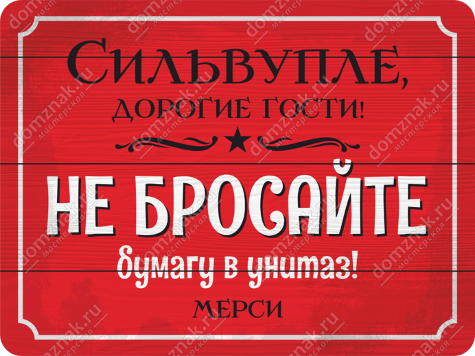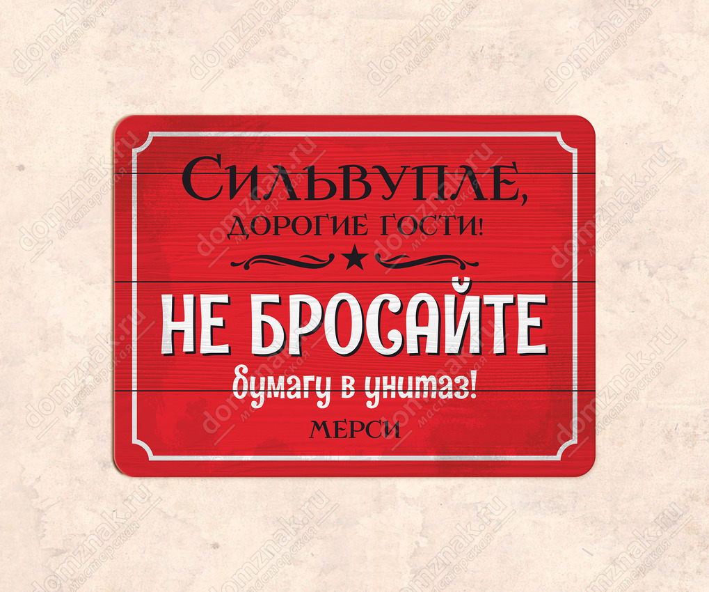 Табличка «Сильвупле! Не бросайте бумагу в унитаз» изготовлена из пластика ПВХ, толщиной 4 мм. Изображение наносится по технологии УФ-печати. Табличка предназначена для использования как в помещении, так и на улице.