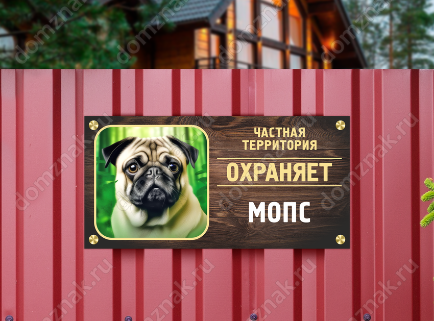 Табличка «Частная территория. Охраняет Мопс» изготавливается на основе из пластика ПВХ или оцинкованного металла.