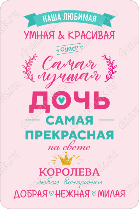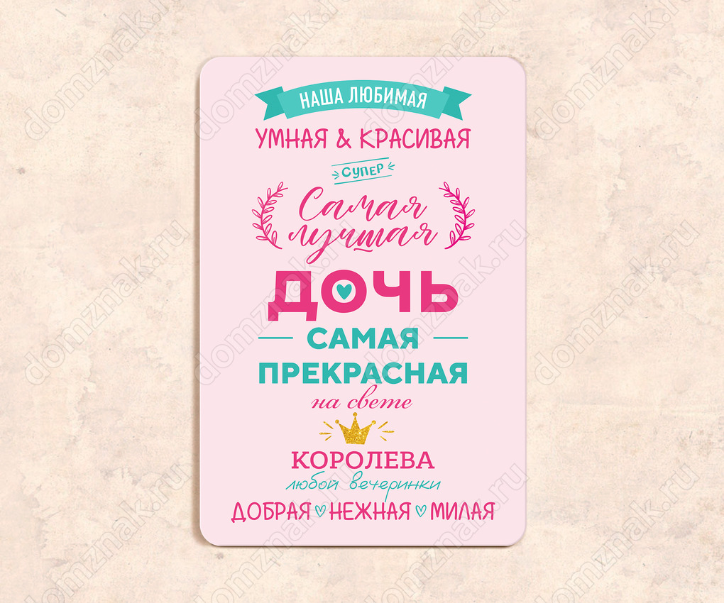 Табличка «Самая лучшая дочь» изготовлена из пластика ПВХ, толщиной 4 мм. Изображение наносится по технологии УФ-печати. Табличка предназначена для использования как в помещении, так и на улице.