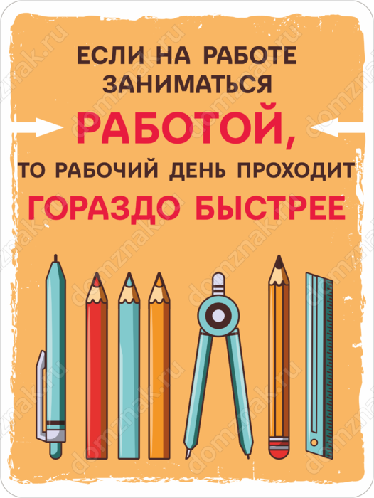 Табличка «Если на работе заниматься работой, то рабочий день проходит гораздо быстрее» изготовлена из пластика ПВХ, толщиной 4 мм. Изображение наносится по технологии УФ-печати. Табличка предназначена для использования как в помещении, так и на улице.
