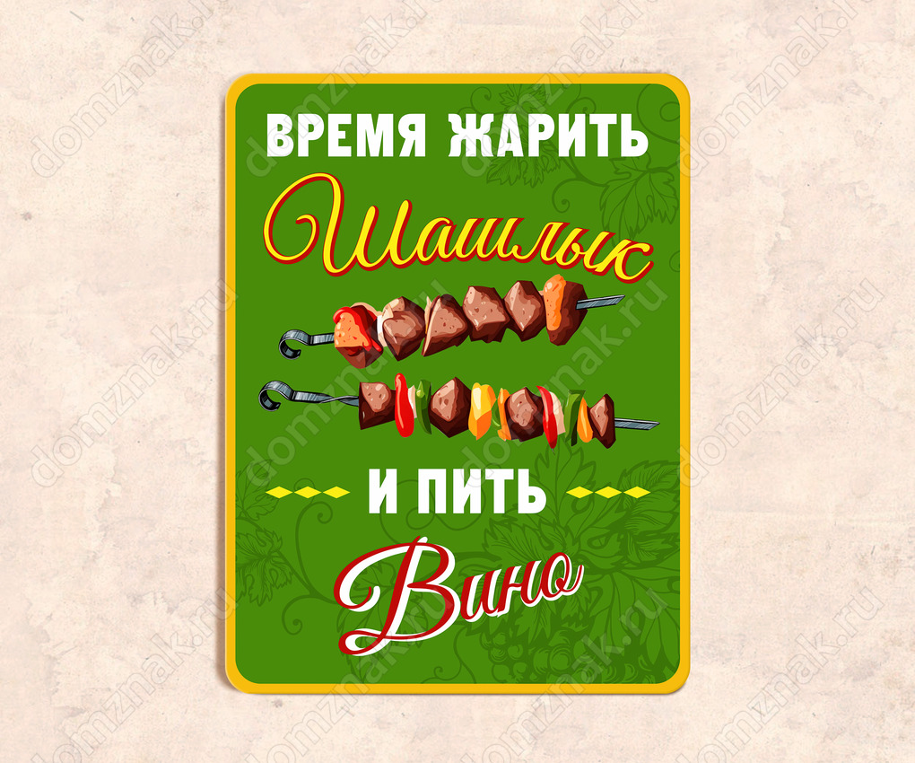 Табличка «Время жарить шашлык и пить вино» изготовлена из пластика ПВХ, толщиной 4 мм. Изображение наносится по технологии УФ-печати. Табличка предназначена для использования как в помещении, так и на улице.