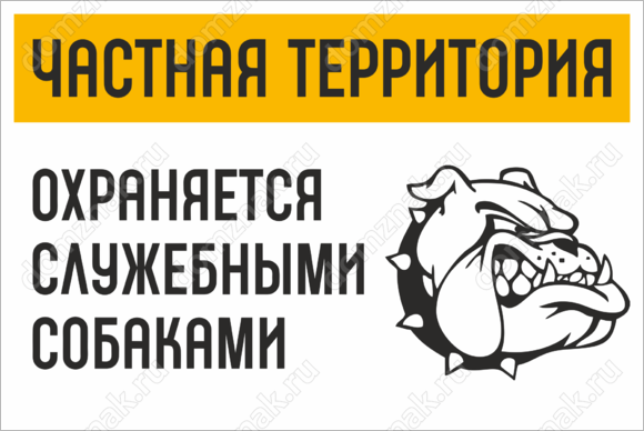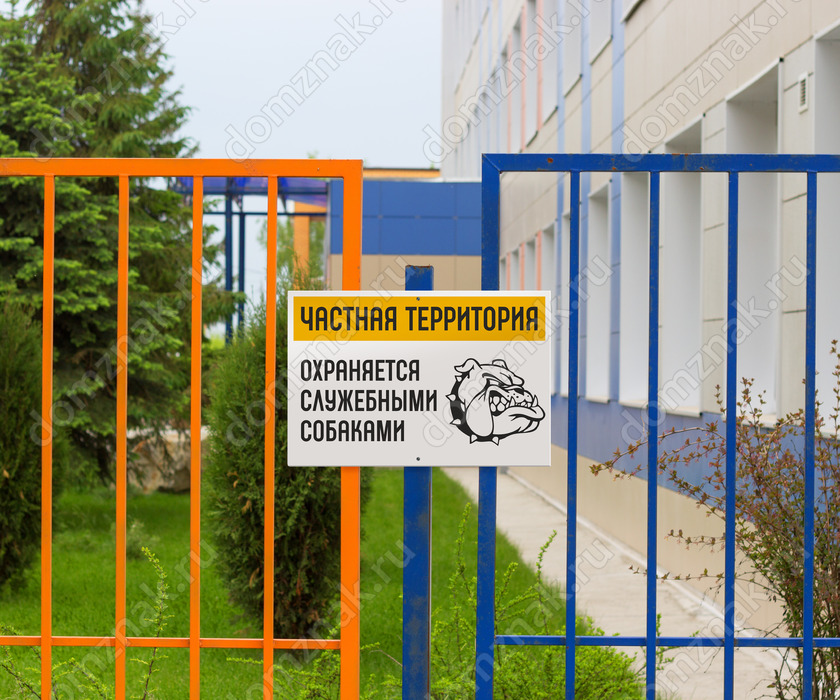 Табличка «Частная территория! Охраняется служебными собаками» изготавливается на основе из пластика ПВХ или оцинкованного металла.