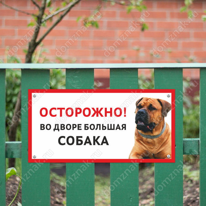 Ваш двор охраняет большая собака? Сообщите об этом всем, кто проходит мимо и тем, кто подумывает о противоправных действиях. Вы можете купить у нас табличку «Во дворе большая собака» со стандартным изображением или заказать вариант, в котором рядом с надписью разместится фотография вашей сторожевой собаки.