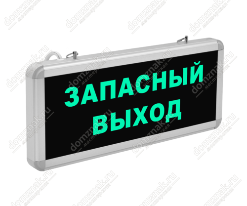 Световой указатель «Запасный выход» имеет встроенную батарею, которая обеспечит автономную работу устройства, при потере электричества, на протяжении 90 минут. Корпус устройства выполнен из алюминия и цветного стекла. Светильник может крепиться как на стены, так и на потолок при помощи цепочки (поставляется отдельно). При установке второго стекла, световой указатель становится двусторонним.