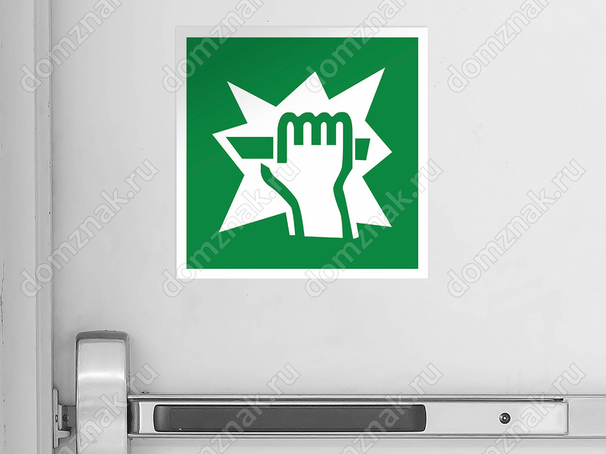 Знак «Для доступа вскрыть здесь» (код E17) устанавливается на дверях, стенах помещений и в других местах, где для доступа в помещение или выхода необходимо вскрыть определенную конструкцию, например разбить стеклянную панель и т.п.