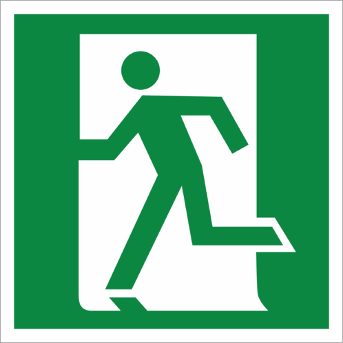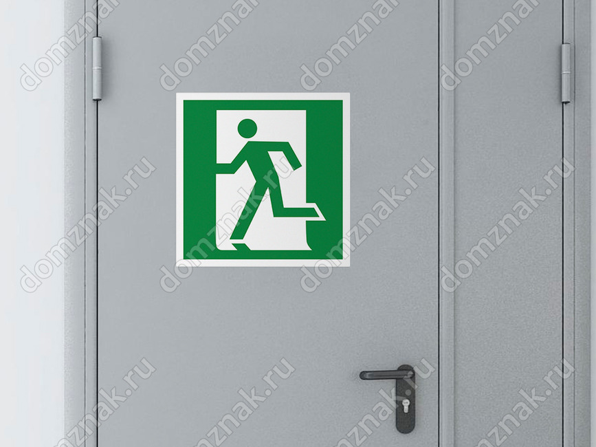 Эвакуационный знак «Выход здесь» (код E01-01), устанавливается над дверями (или на дверях) эвакуационных выходов, открывающихся с левой стороны. На стенах помещений вместе с направляющей стрелкой для указания направления движения к эвакуационному выходу.